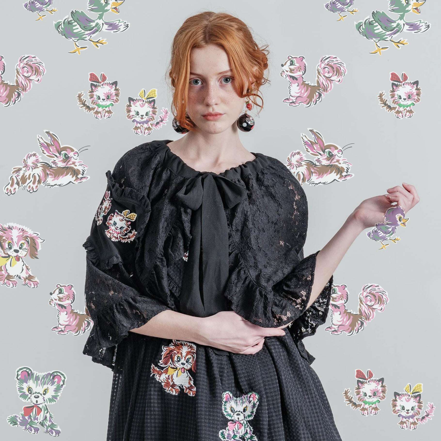 レース素材の巻きエプロン はケープにしたり色んなアレンジで使え、カジュアルにもドレッシーにも楽しめます♡スカートはレトロアニマル柄で総ゴムなのでゆったりしてて楽に着ることが出来ます◎