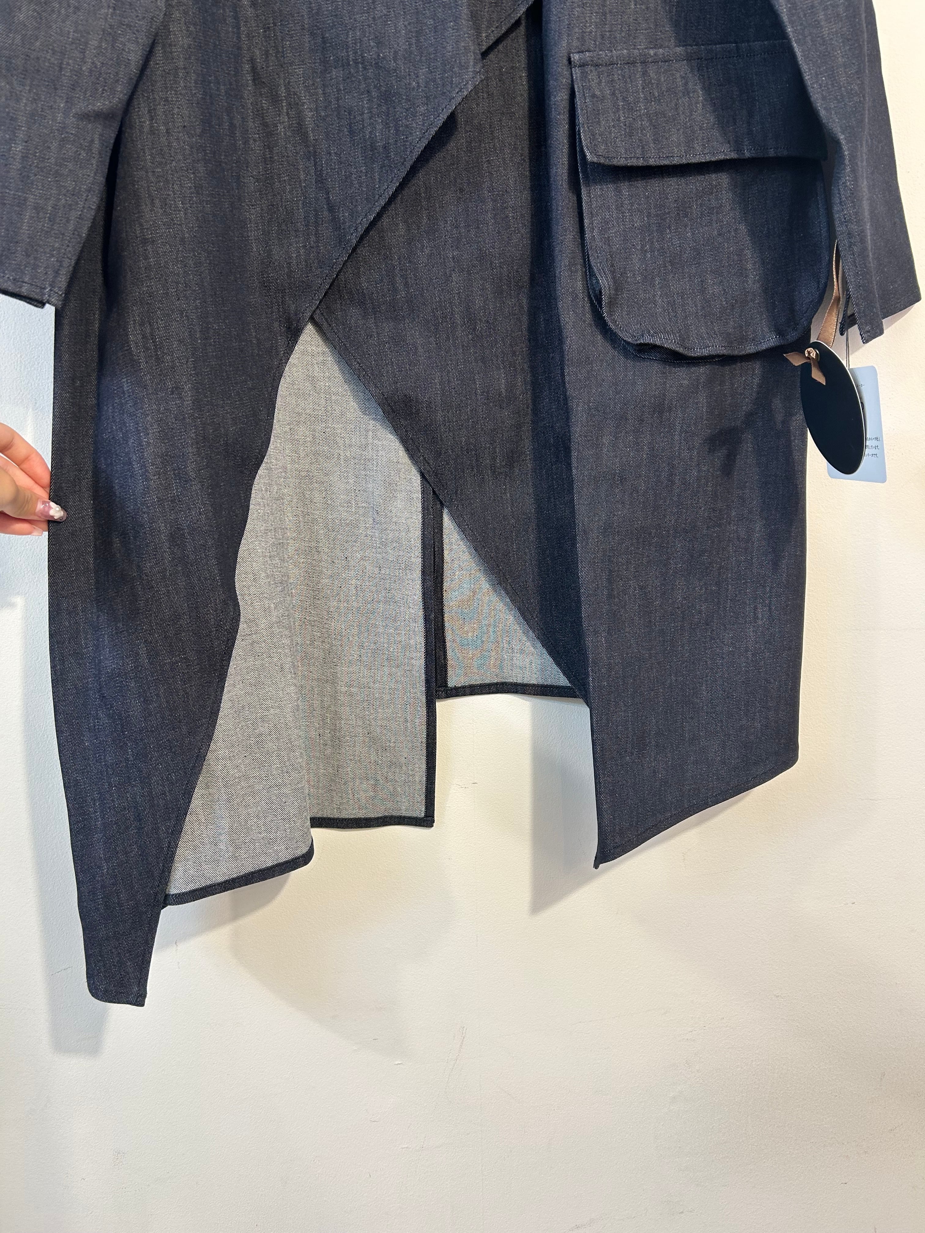 《デニムアシメシャツコート》 ユニークなアシンメトリーデザインが魅力のデニムシャツコートです☆ 柔らかく着心地の良いデニム素材を使用しているため、デイリーコーデにはもちろん、少し特別なシーンにも活躍します。