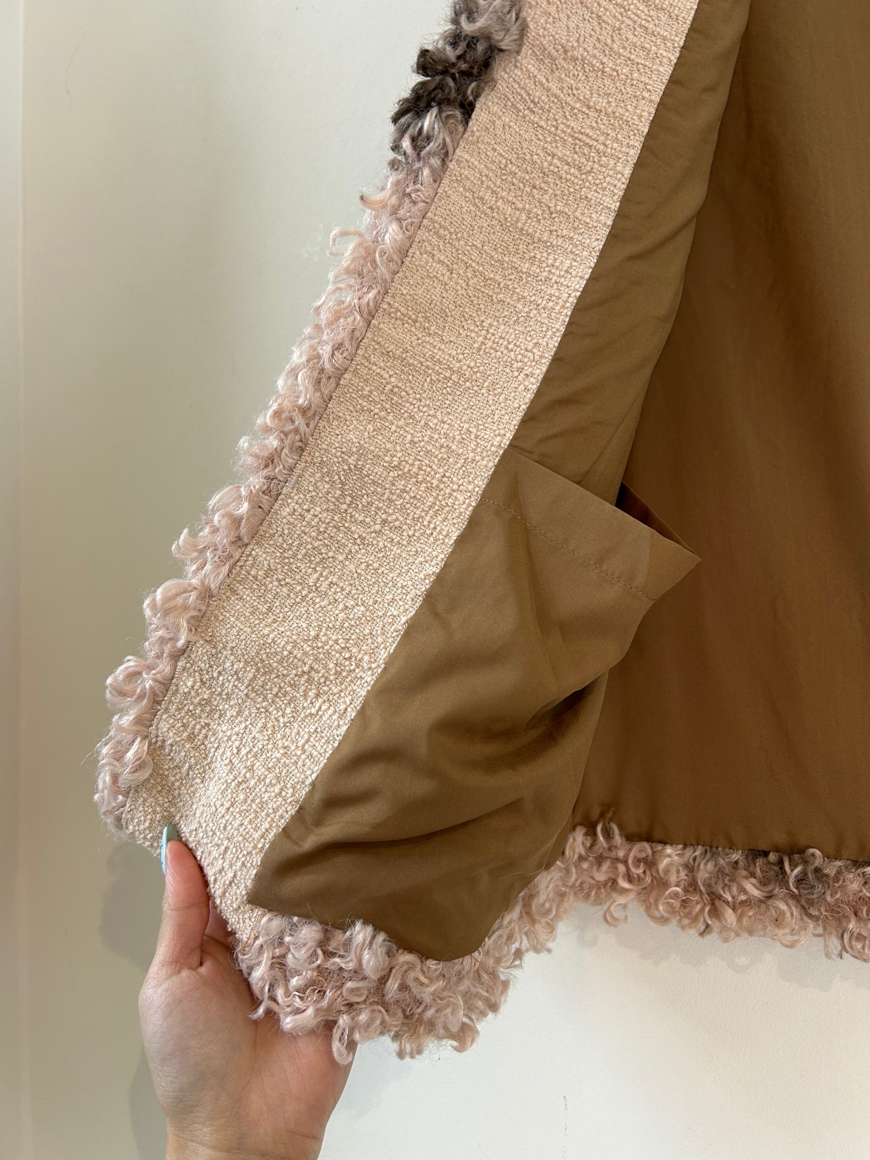 リバーシブルで着れて,ライダースなどの上から着ると更にオシャレに!!コートなどにも合わせやすく、ベビーピンクカラーでふんわりした可愛らしい印象も◎ ライダースに合わせると抜け感コーデに◎
