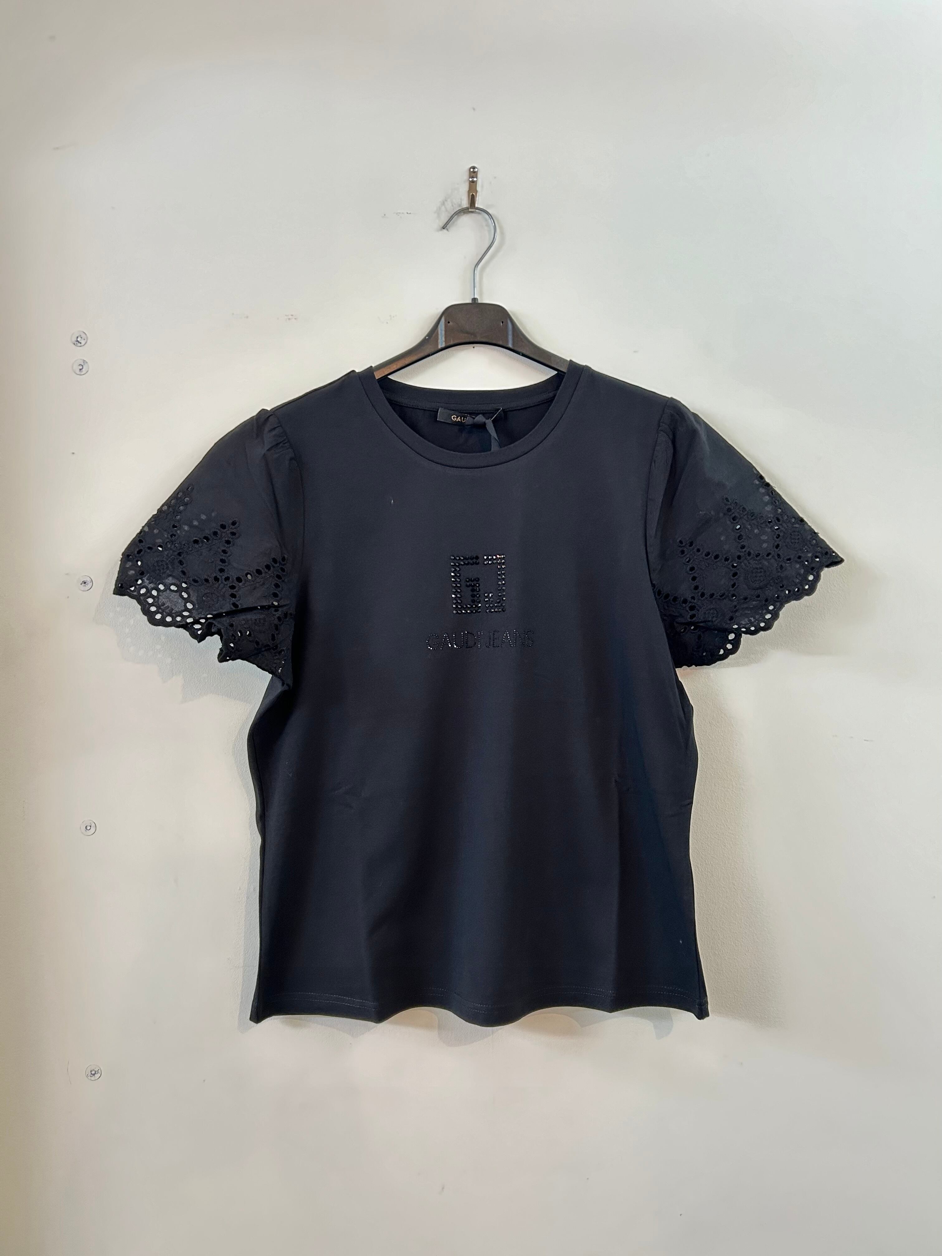 袖部分は短すぎず、女性らしいレースデザインでパンツにこのTシャツを一枚合わせて頂くだけでもお洒落♡
