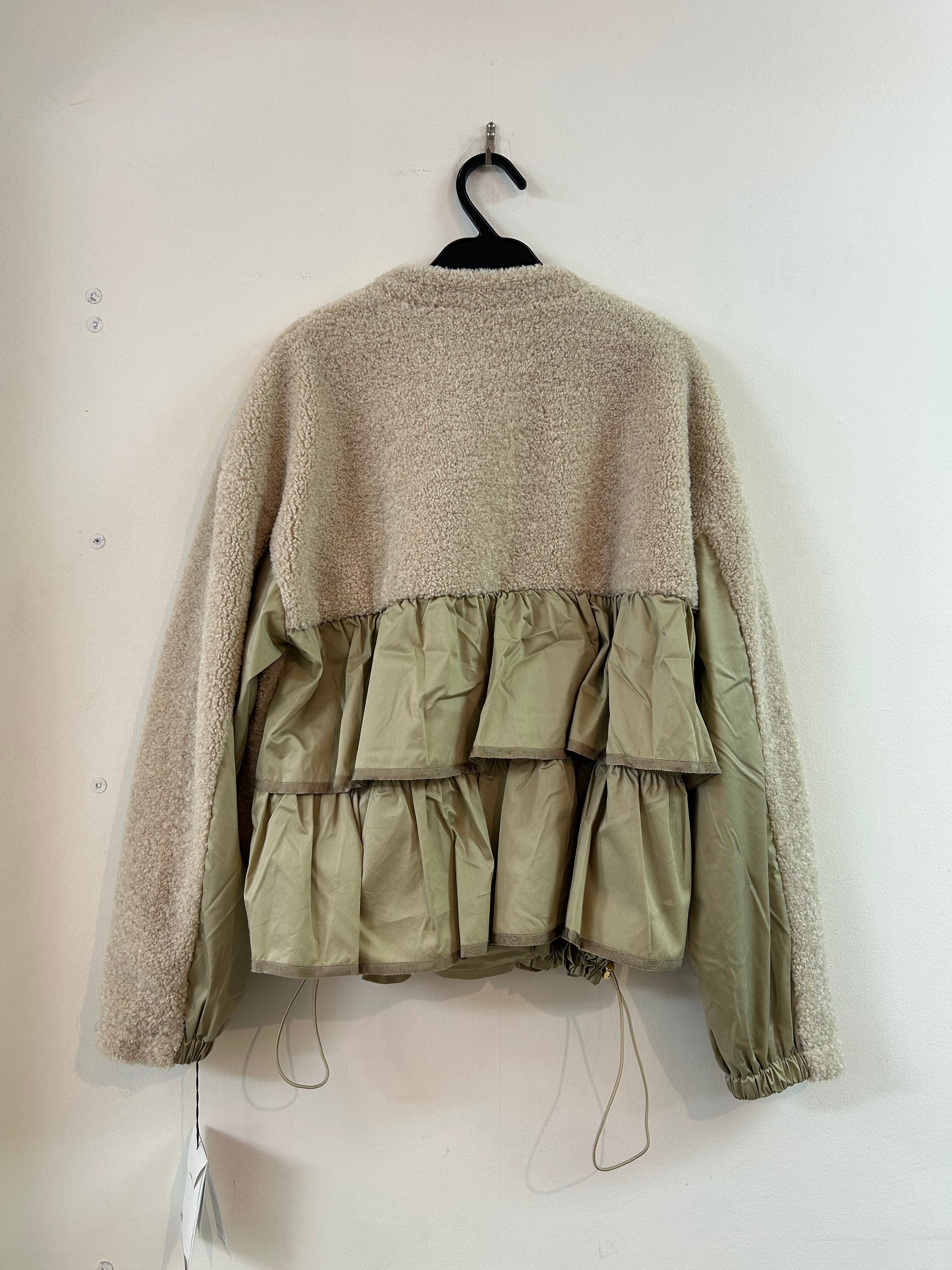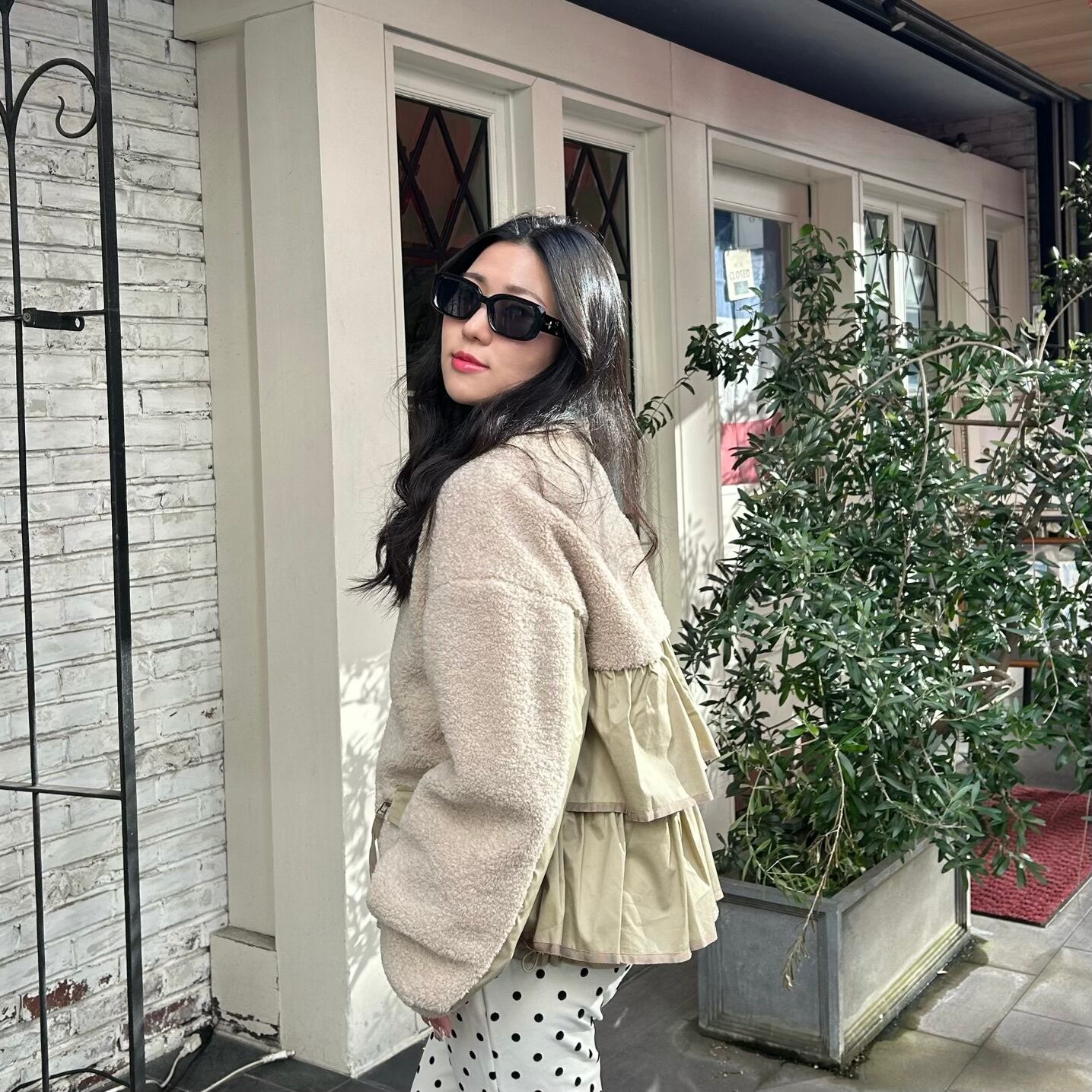 カジュアルなボアアウターにバックがフリルになっていて、カジュアルすぎない女性らしいフェミニン要素がプラスされた可愛いアウター♡